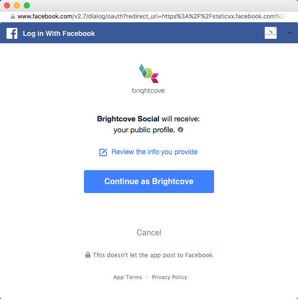 - Es öffnet sich ein Dialog, in dem bestätigt wird, dass Brightcove Social Ihre Profilinformationen erhält. Klicken Sie auf Continue.