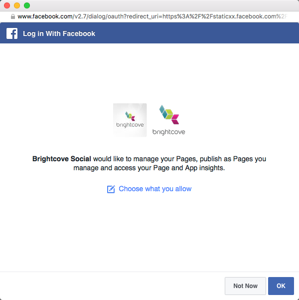 - Es wird ein Dialog geöffnet, in dem bestätigt wird, dass Brightcove Social Ihre Seiten verwalten und veröffentlichen und auf Ihre Seiten- und App-Erkenntnisse zugreifen kann. Klicken Sie auf OK.