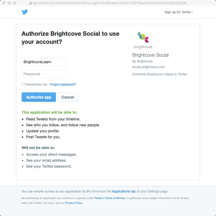 - Sie werden aufgefordert, sich bei Ihrem Twitter-Account anzumelden und Brightcove Social zur Nutzung Ihres Kontos zu autorisieren. Melden Sie sich bei dem Konto an, auf dem Sie Videos posten möchten. Wenn Sie nicht aufgefordert werden, sich anzumelden, sind Sie möglicherweise bei einem Twitter-Account angemeldet. Stellen Sie sicher, dass Sie bei dem richtigen Konto angemeldet sind, bevor Sie fortfahren. Klicken Sie auf App autorisieren.
