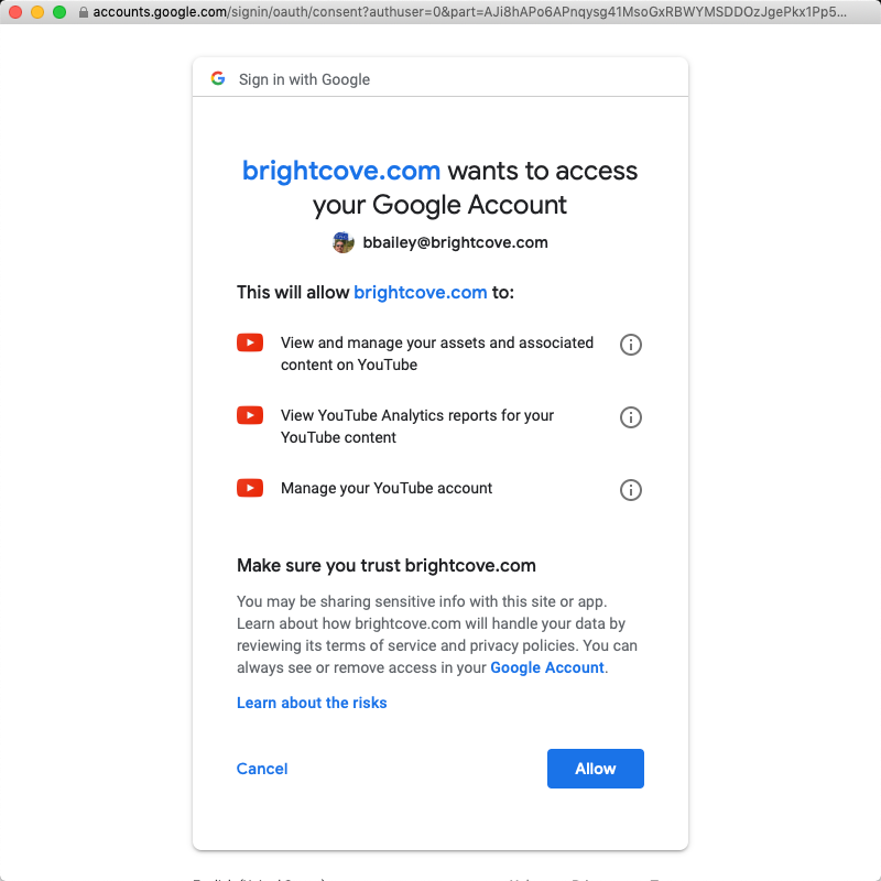 - Ein Dialog wird geöffnet, in dem Sie um Erlaubnis zur Verwaltung Ihres YouTube-Kontos gebeten Überprüfen Sie oben rechts im Dialogfeld, um zu bestätigen, dass Sie das richtige Google-Konto verwenden. Wenn nicht, wählen Sie mit dem Dropdown-Menü das Google-Konto aus, an das Sie Videos verteilen möchten. Klicken Sie auf Allow (Zulassen).