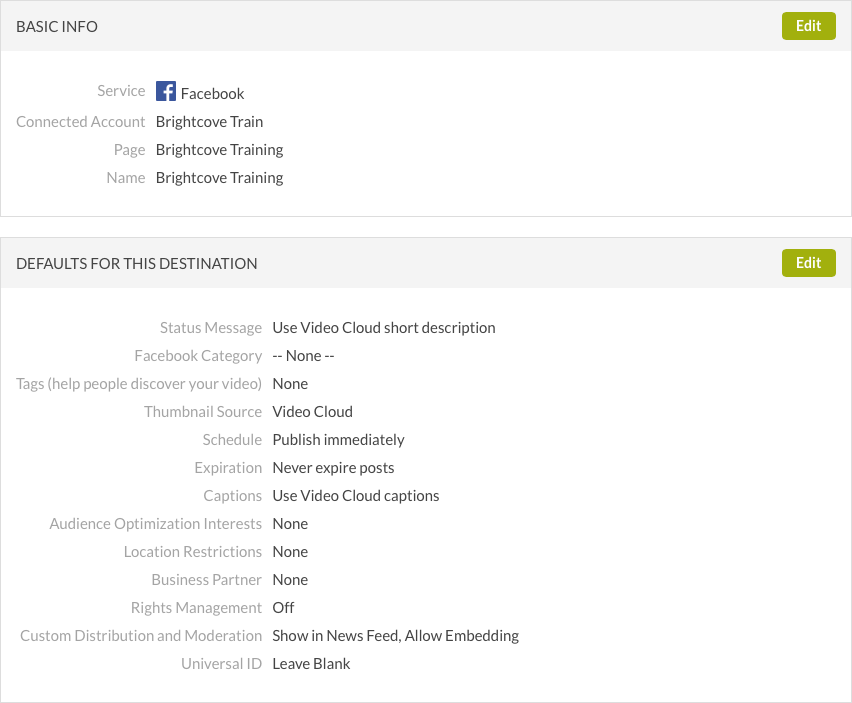 Die Standardwerte des Ziels werden als Standardvideoeigenschaften verwendet, wenn Videos auf sozialen Plattformen veröffentlichtwerden. Um die Standardeinstellungen für die Veröffentlichung von Facebook-Zielen zu konfigurieren, klicken Sie auf den Zielnamen und dann im Abschnitt DEFAULTS FOR THIS DESTINATION auf Bearbeiten . Die folgenden Facebook-Videoeigenschaften können konfiguriert werden: