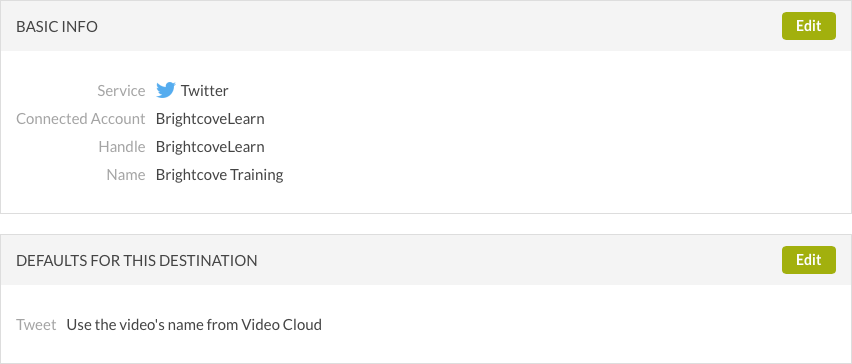 Die Standardwerte des Ziels werden als Standardvideoeigenschaften verwendet, wenn Videos auf sozialen Plattformen veröffentlichtwerden. Um die Standardeinstellungen für die Veröffentlichung von Twitter-Zielen zu konfigurieren, klicken Sie auf den Zielnamen und dann im Abschnitt DEFAULTS FOR THIS DESTINATION auf Bearbeiten .