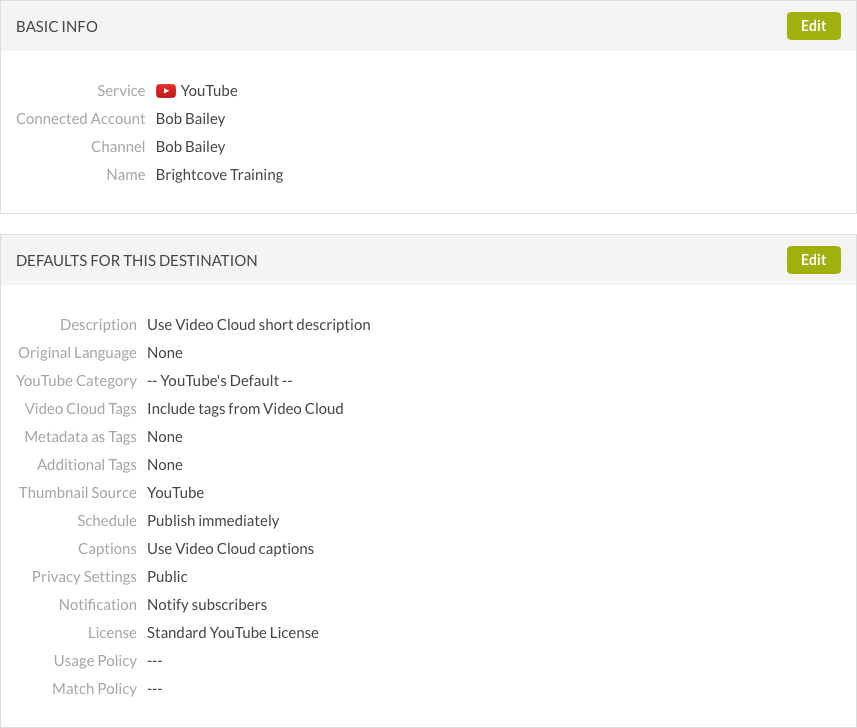 - Grundlegende Informationen und die Standardeinstellungen des Ziels werden angezeigt. Klicken Sie im Abschnitt BASIC INFO auf die Schaltfläche Bearbeiten , um den Zielnamen zu bearbeiten. Informationen zum Konfigurieren von Standardwerten finden Sie im Abschnitt Einstellung der YouTube-Standardwerte .