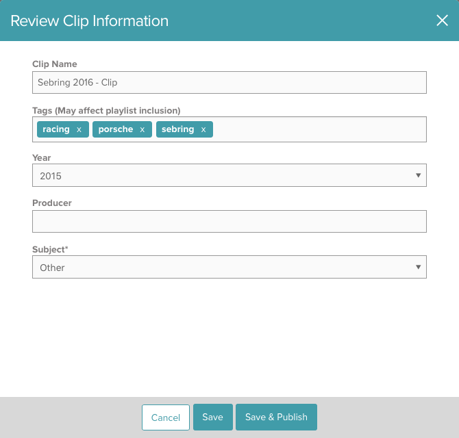 - Überprüfen Sie die Clip-Informationen. Der Clip-Name, die Tags und alle benutzerdefinierten Felder, die für das Konto erstellt wurden, können bearbeitet werden.