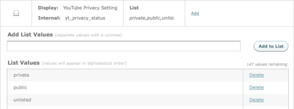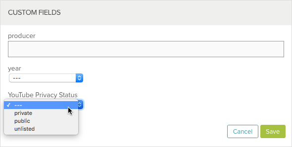 Beginnen Sie, indem Sie Ihrem Konto ein benutzerdefiniertes Feld yt_privacy_status vom Typ List hinzufügen. Weitere Informationen über das Hinzufügen benutzerdefinierter Felder zu einem Konto finden Sie unter Erstellen benutzerdefinierter Metadatenfelder. Der Wert dieses benutzerdefinierten Feldes legt die Datenschutzeinstellung des YouTube-Videos fest: