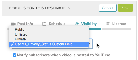 Bearbeiten Sie das YouTube-Publishing-Ziel und legen Sie die Datenschutzeinstellung auf Yt_Privacy_Status Custom Field verwendenfest.